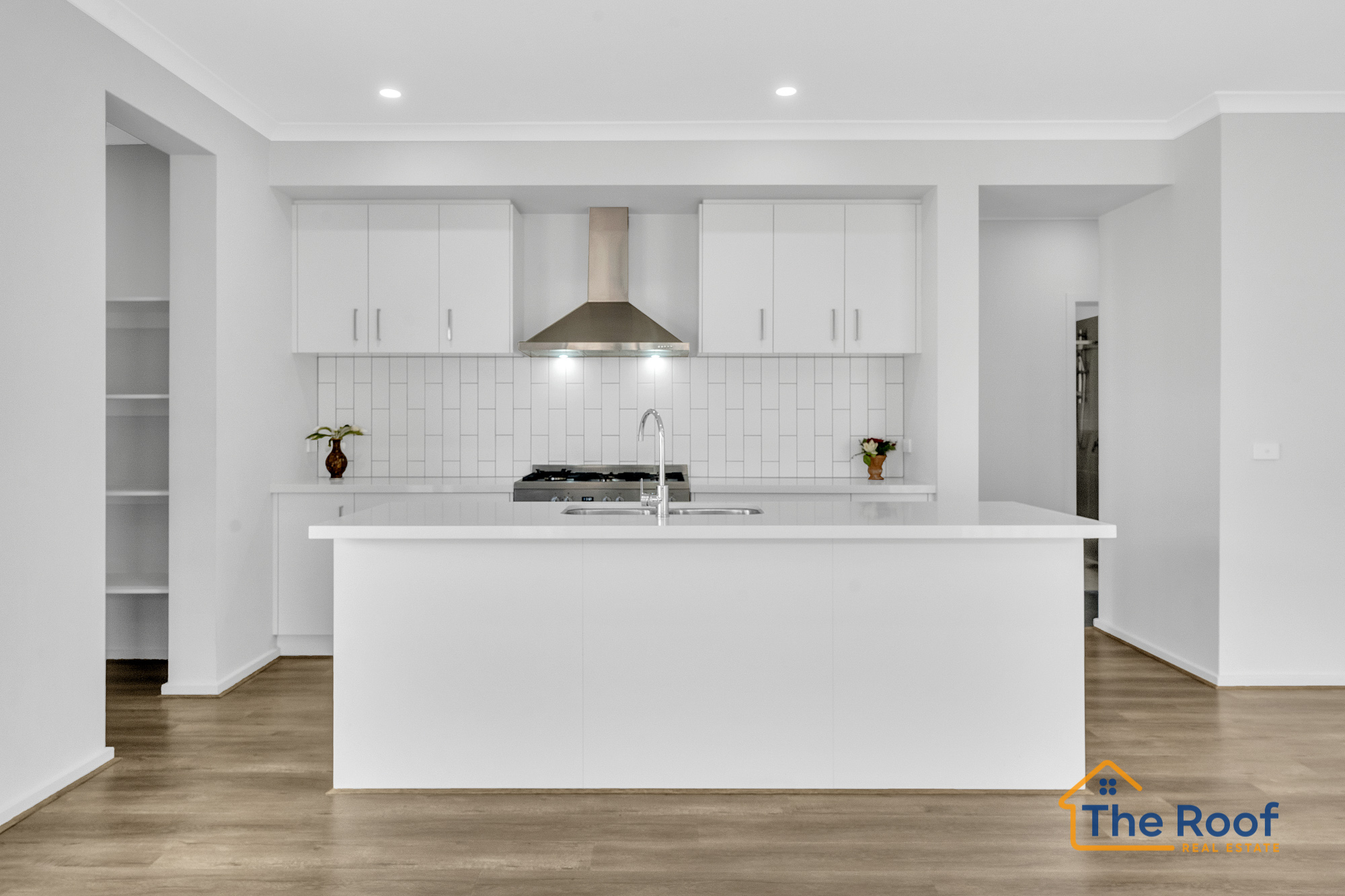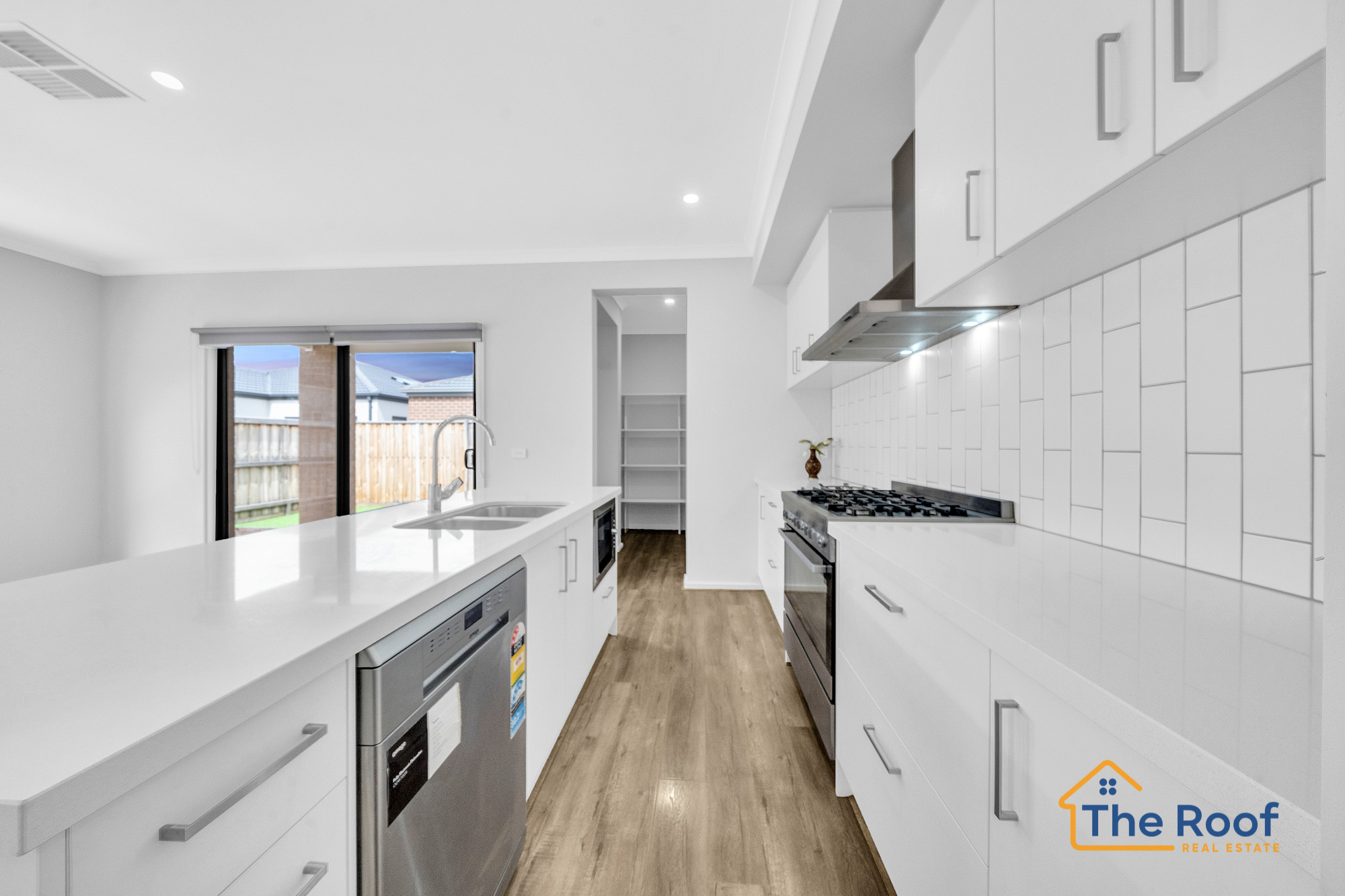 Open plan kitchen with Spacious pantry & separate dining featuring high , 40mm stone bench tops, 900mm oven with Gas cooktop, tiled splash back, Dishwasher , pantry , ample storage, LED throughout the house.
